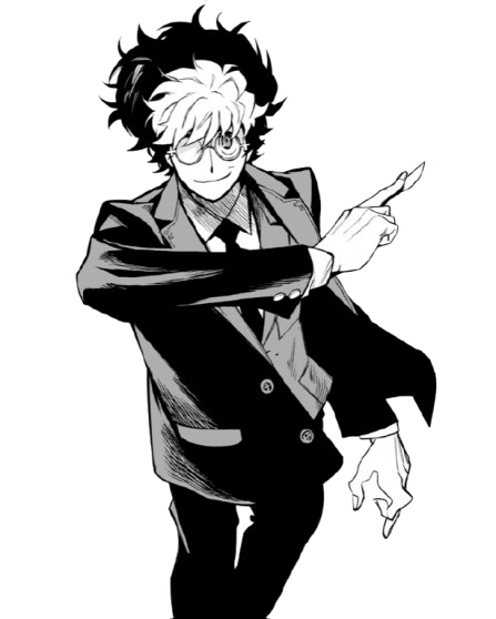 Haiji has messy, dark hair with light-colored streaks in his bangs, he also round glasses with unique cross-shaped charms or accents attached to the frames. For his clothing, he wears a formal dark suit with a tie and a vest.